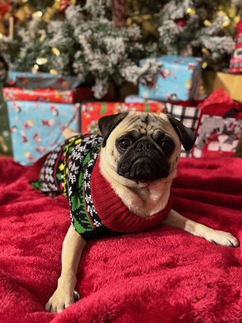 This is Obi and he is 3 years old. He is royalty because he was my first ever pug. He made me fall in love with the pug breed with his energy, comical behavior, strong stubbornness and devotion. He is a fierce protector of his home against delivery drivers and is always up to climbing into a lap to cuddles.