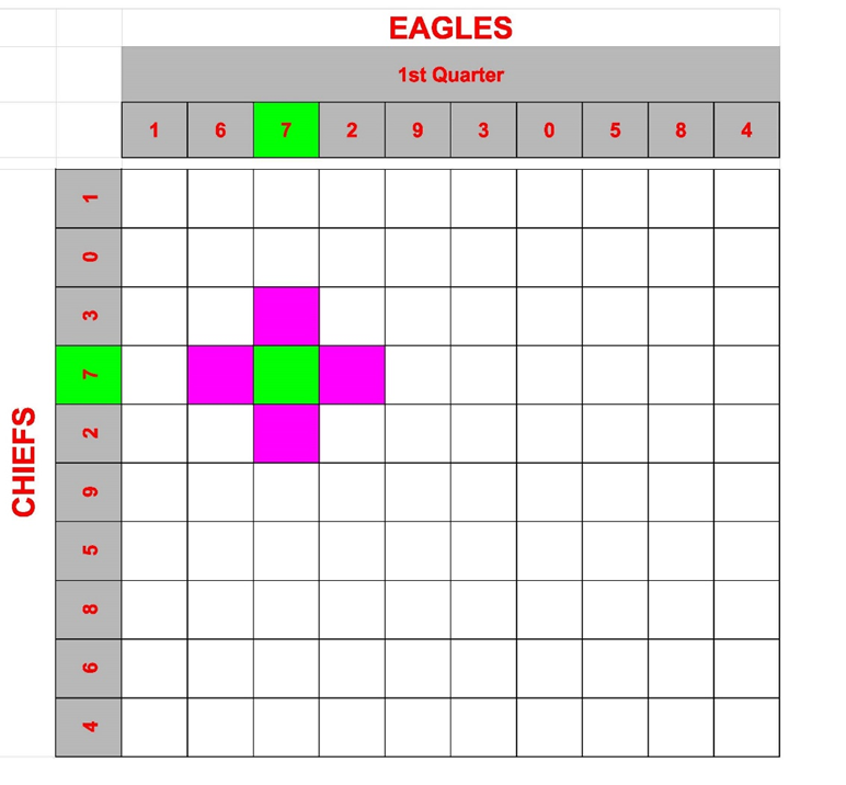 This is an example from 2025 Super Bowl; At the end of the First Quarter the score was Eagles 7 Chiefs 7. The person with the GREEN SQUARE on the grid won $ 500 and the people who had the PURPLE SQUARES won $ 100.