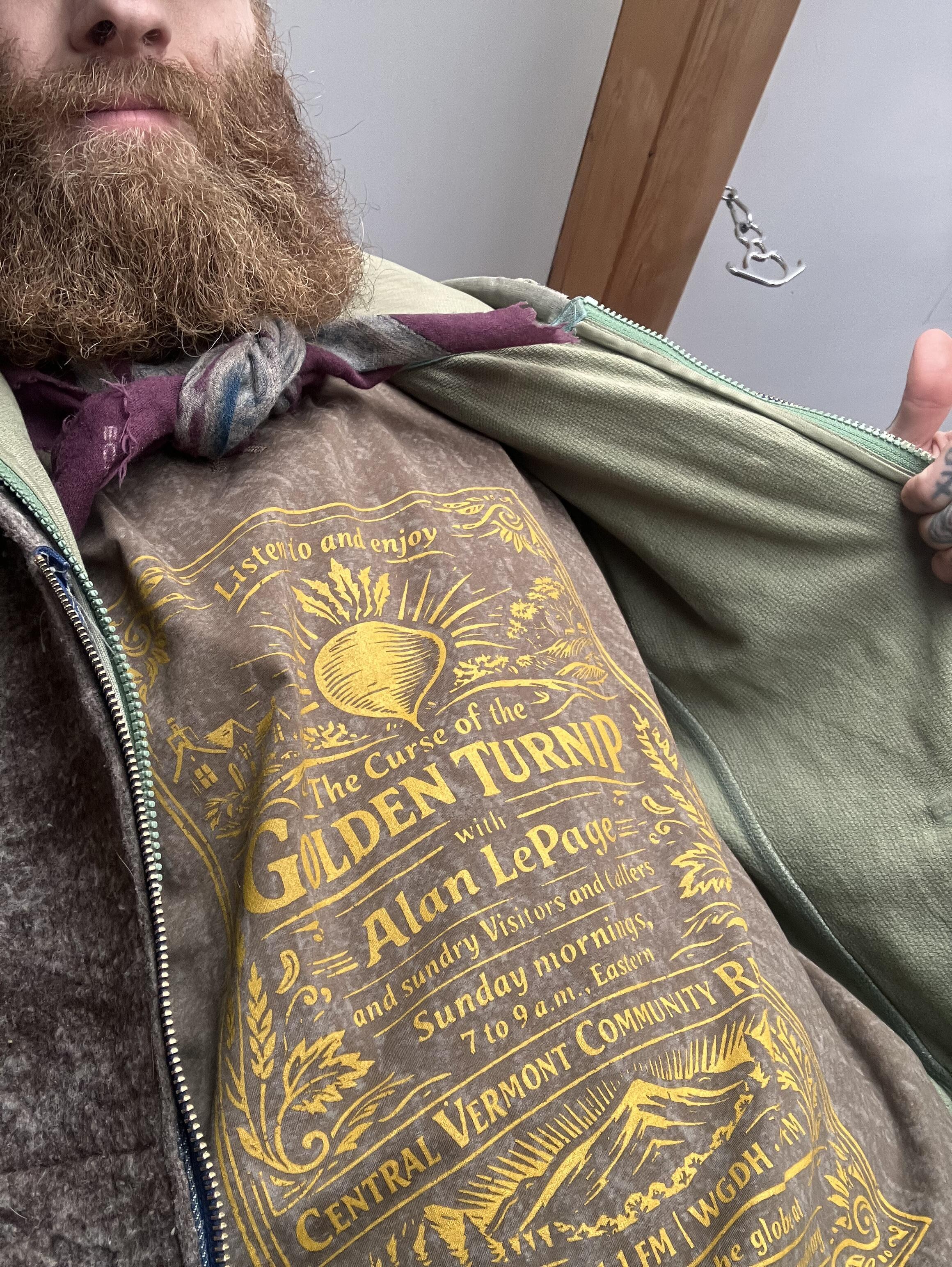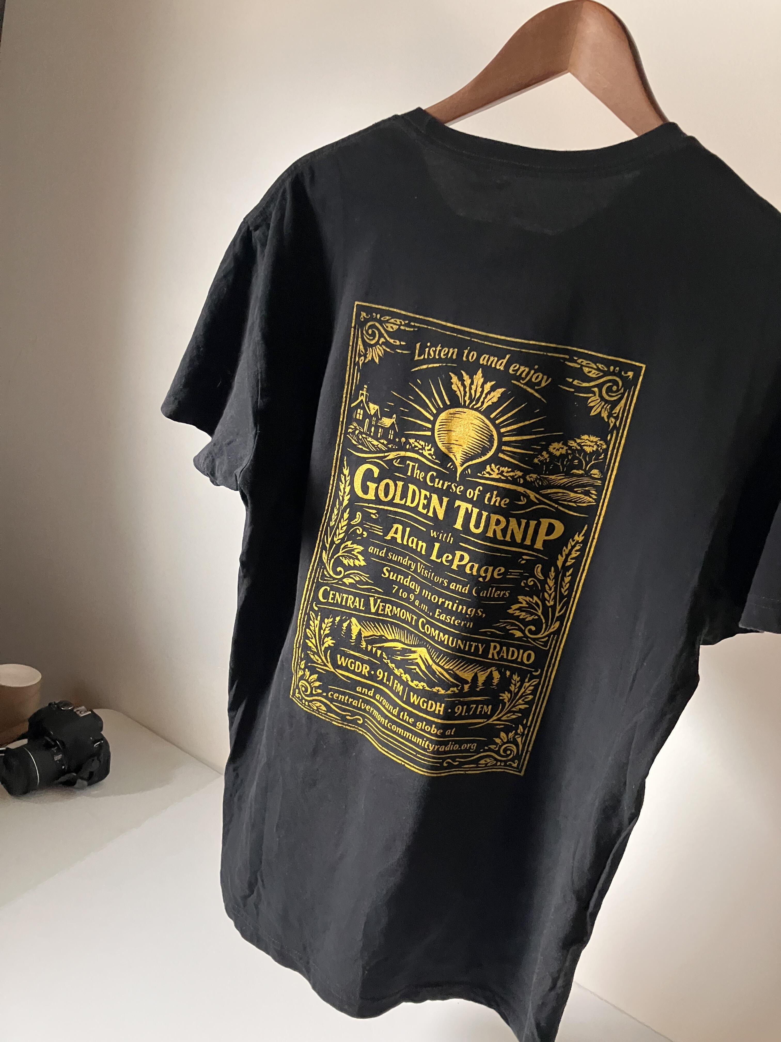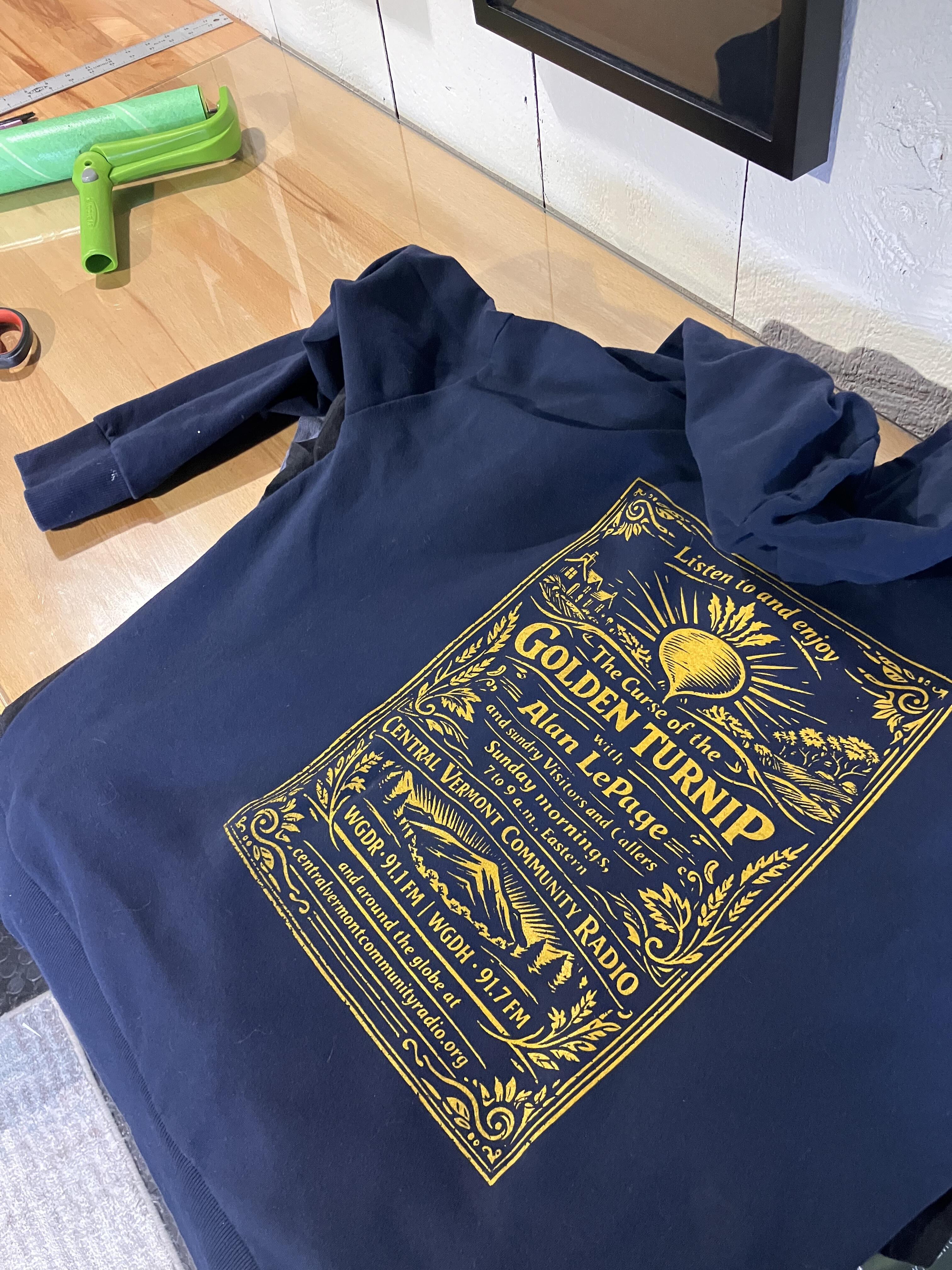 Printed by Hippies Screen Printing in Barre, VT. Graphic designed by Pauline, our faithful listener in Indiana.