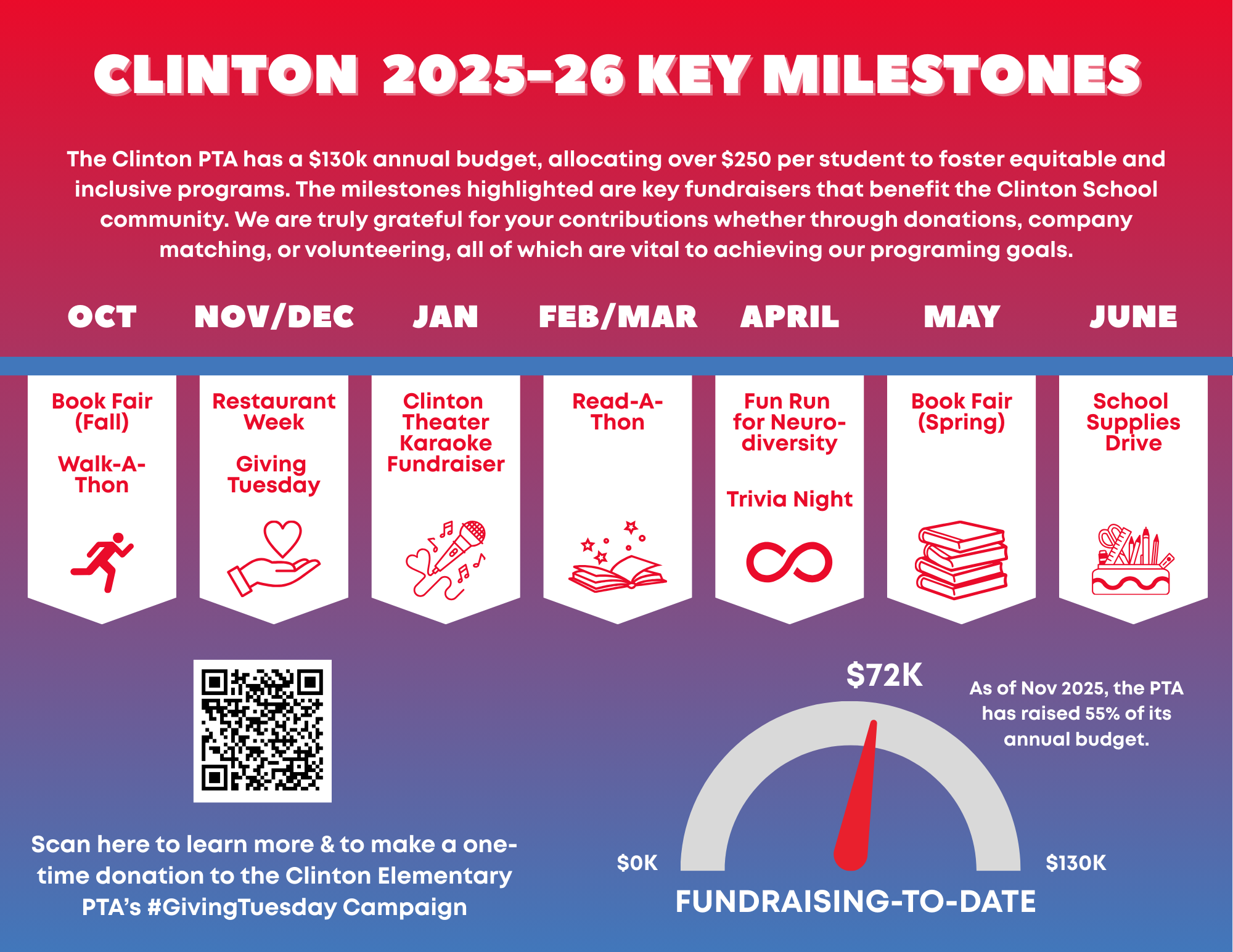 Fun Fact #2: As of November 2025, the PTA has raised 55% of our $130,000 annual budget.