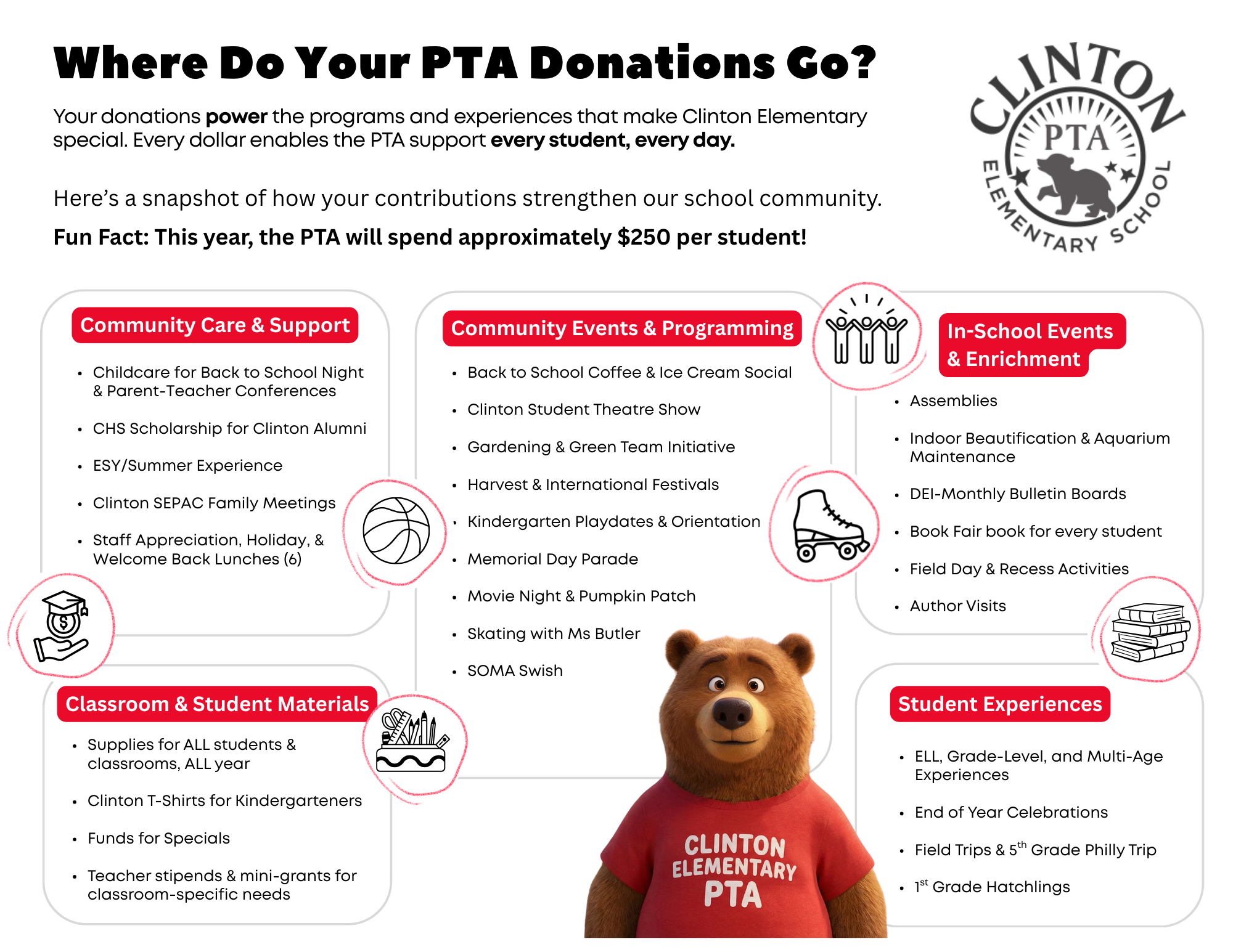 The Clinton School PTA's annual budget for the 2025-2026 school year is $130,000, which allows us to foster equitable and inclusive programs that enrich the Clinton School experience. Explore the Clinton School PTA's "Where Do Your PTA Donations Go?" for a snapshot of how your donation supports the Clinton School community. To discover more about the PTA’s fundraising initiatives and upcoming events, check out “Clinton 2025-26 Key Milestones.”