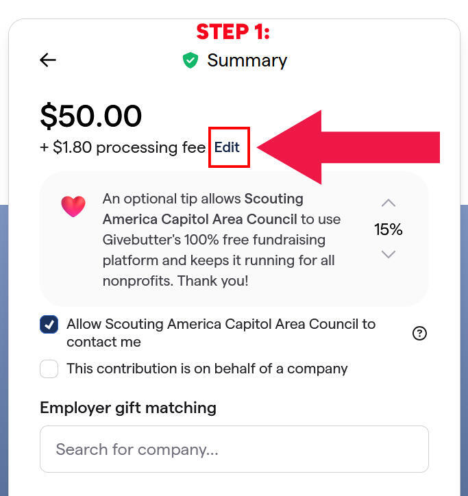 1) Click/touch the word "Edit" next to the processing fee amount.