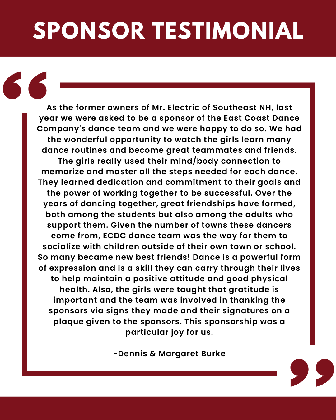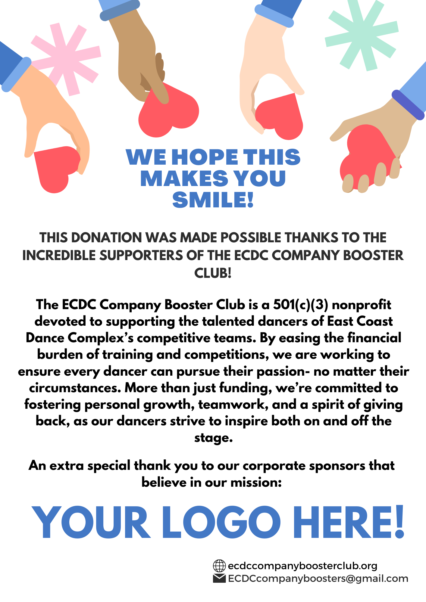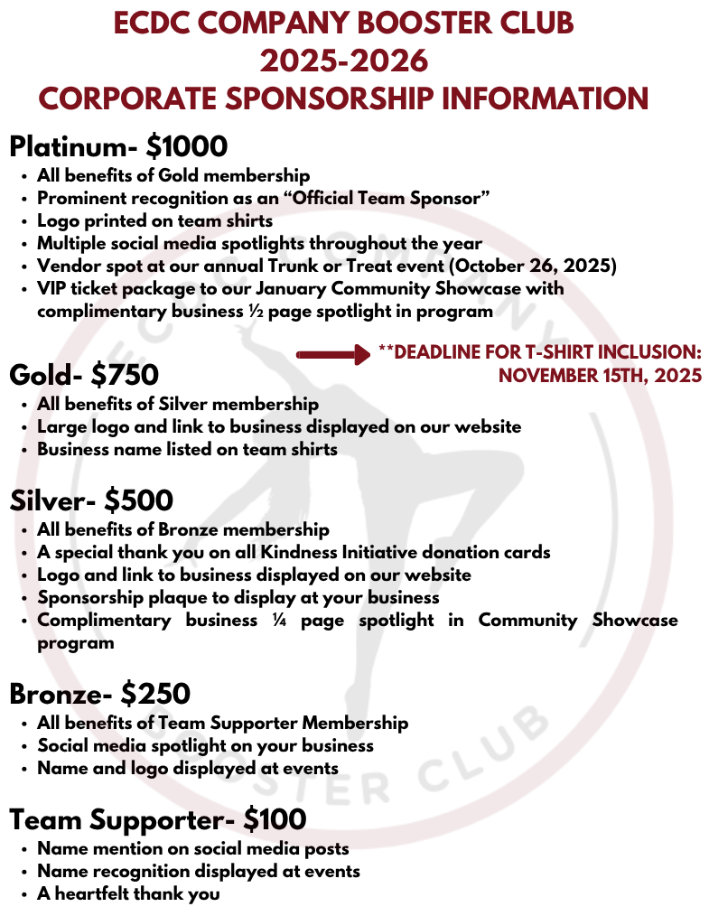 My name is Alicia Redimarker, and I am the president of the ECDC Company Booster Club, a volunteer-led nonprofit organization supporting nearly 40 talented dancers of the East Coast Dance Complex competitive teams. We are currently seeking valued business partners to support our upcoming season through sponsorship opportunities.