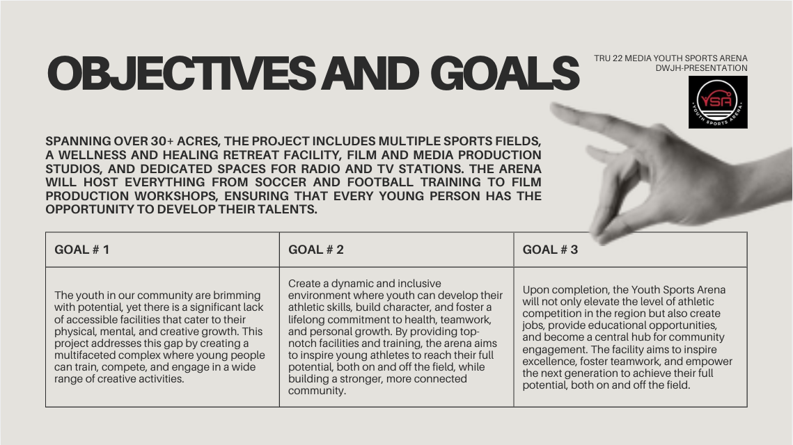 Your support will directly impact the construction of a state-of-the-art facility designed to empower youth through sports, media, and wellness. From soccer and football fields to film studios and wellness centers, this arena will serve as a vibrant community hub fostering growth, creativity, and healthy lifestyles.