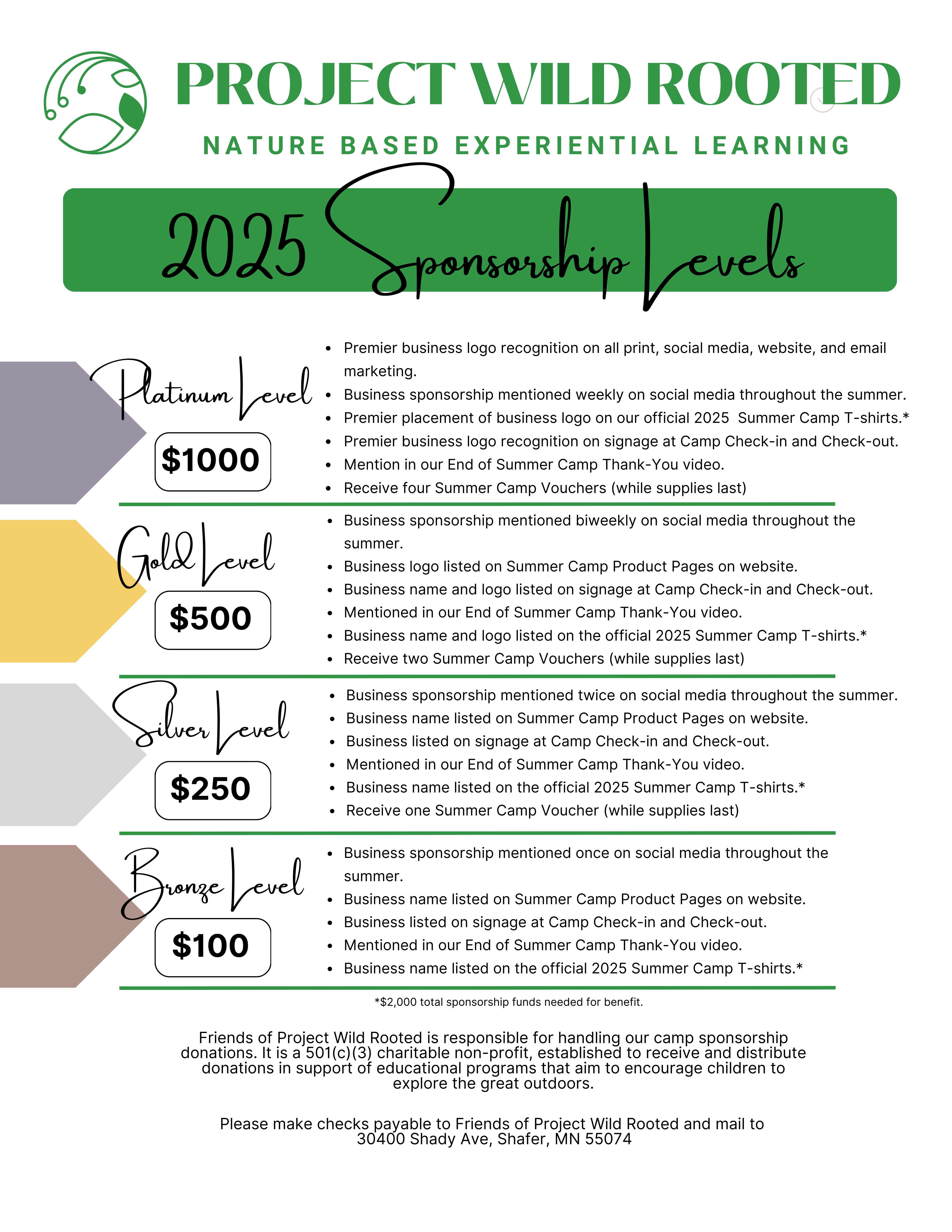 By donating to this campaign, you can make a meaningful impact. Whether as a leveled sponsor with recognition or simply as someone who believes in our cause, your contribution will directly support purchasing camper T-shirts, supplies, and providing scholarships to families in need. You don’t need to commit to a sponsorship package or receive public recognition—every single donation, no matter the size, will help empower local children with unforgettable summer experiences, foster their connection to nature, and build their confidence.
