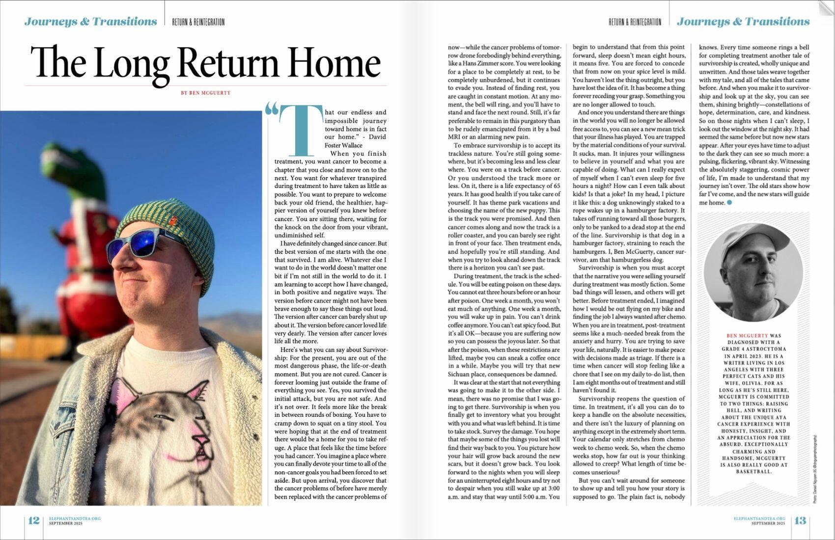 Ben’s first piece of writing about cancer was published in Elephants & Tea, a periodical for AYAs. Titled “The Long Return Home”, Ben’s essay touched on the disorientation he felt upon reaching survivorship post-treatment. The cancer narrative is often more focused on the hardships of treatment and crisis, less so on what happens after you’ve “beat” cancer. When reconciling with what cancer took, Ben came to positive terms with his new self by seeing boundaries and seeing frontiers.