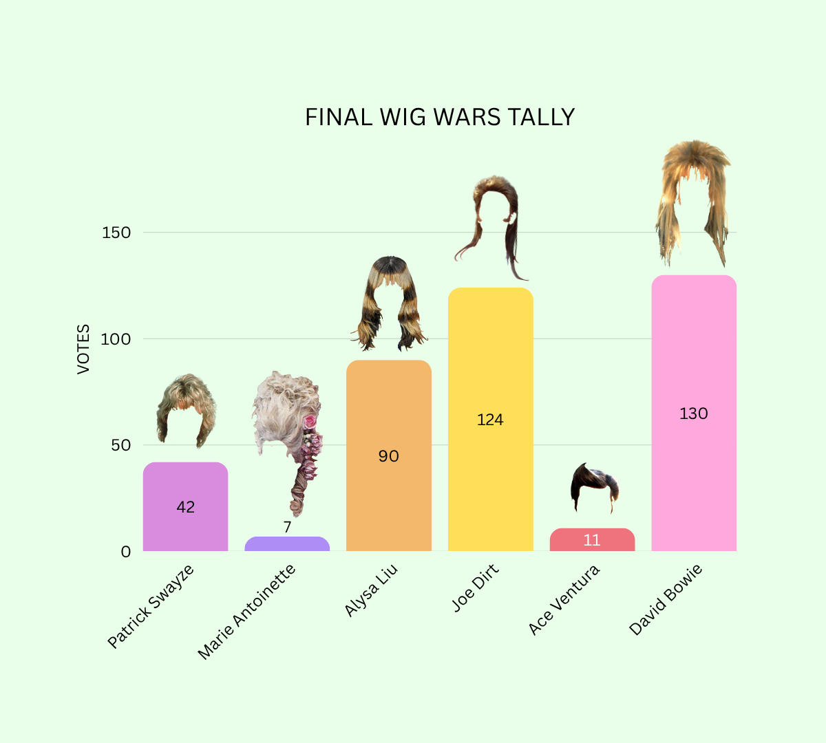 Both winning hairstyles will be made into wigs! Bowie won the vote with only 6 more votes than Joe Dirt. But Eden led her Dirt gang with such verve, and Wendy & Anrina harnessed so much voodoo from their Bowie crew that we declared both wigs winners.