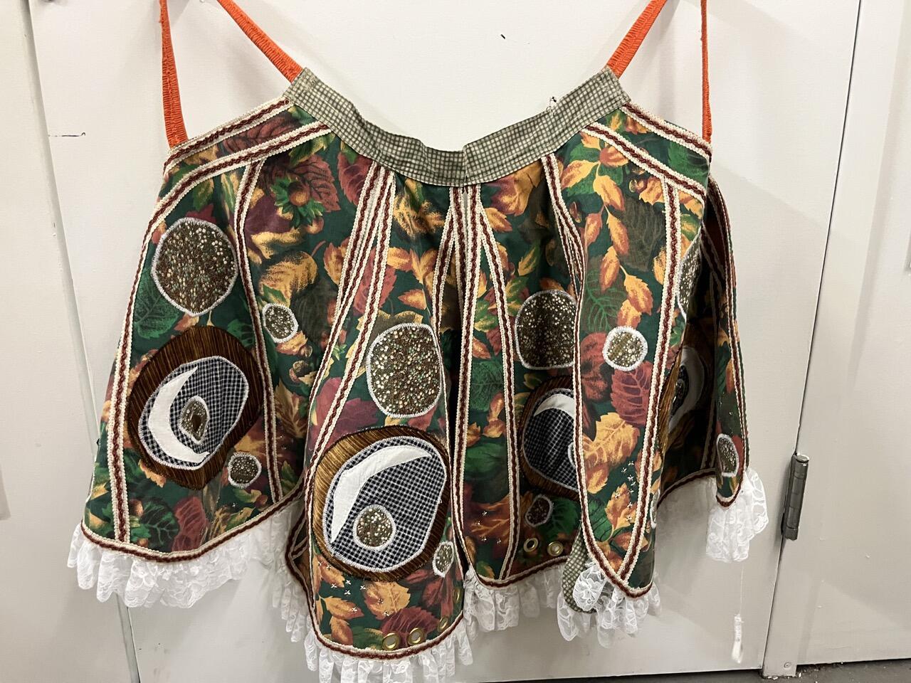 Autumn foliage print, white ruffle trim, brass grommet detail
