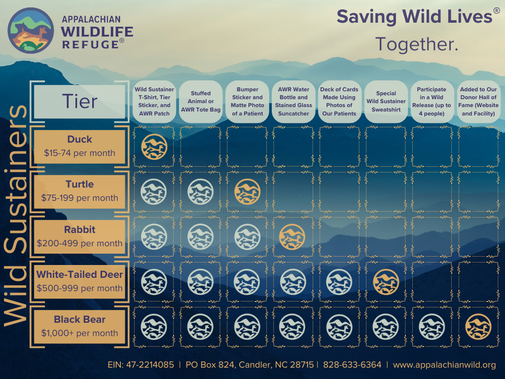 When you support Appalachian Wildlife Refuge, you are not just making a tax-deductible contribution to a worthy cause who is hard at work serving wildlife in need - YOU are saving lives. Your generosity means survival for thousands of wildlife because you are fighting for those who cannot fight for themselves. From the bottom of our hearts, thank you for the incredible impact you have: making a second chance possible for so many.