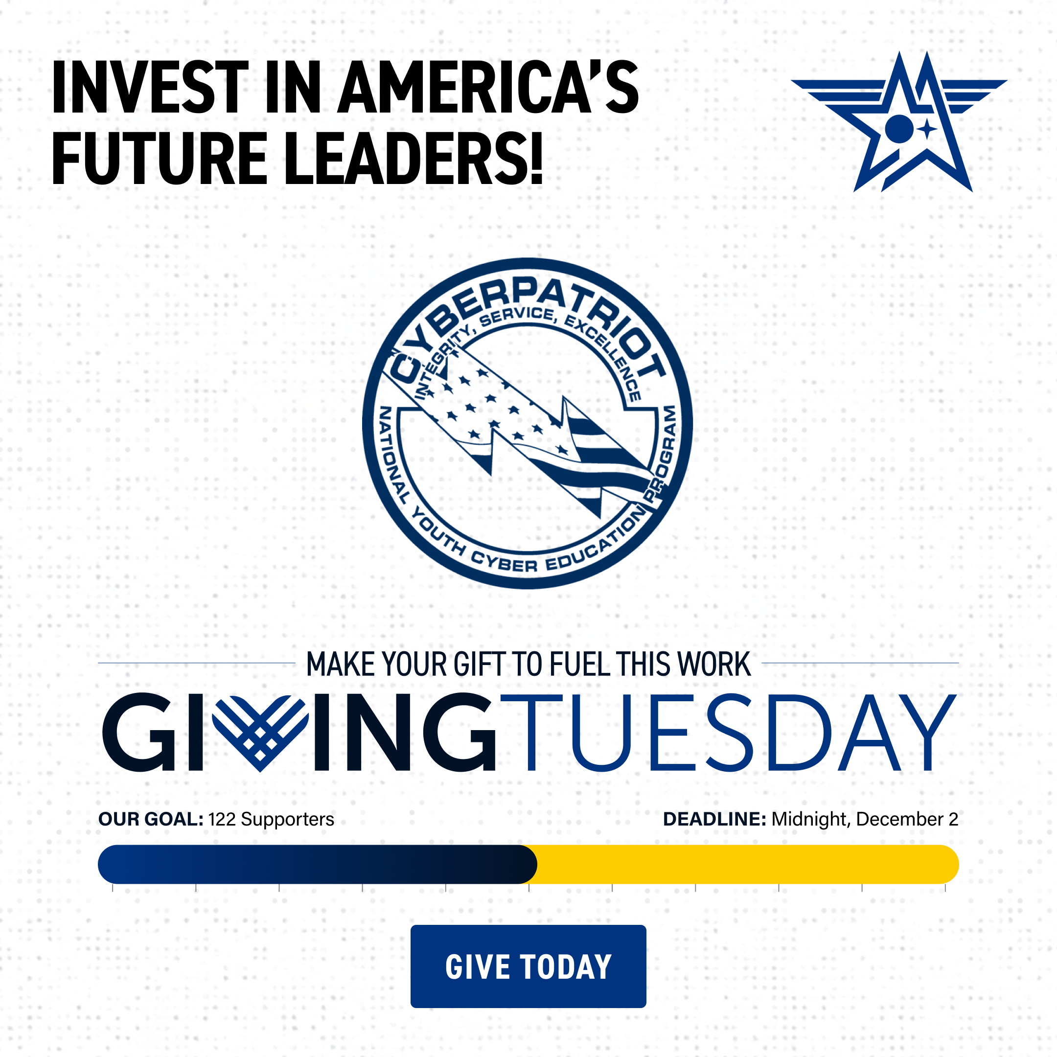 Now in our 18th season, CyberPatriot is the Air & Space Forces Association’s National Youth Cyber Education Program, built to inspire K–12 students to explore careers in cybersecurity and other STEM fields that are critical to our nation’s future.