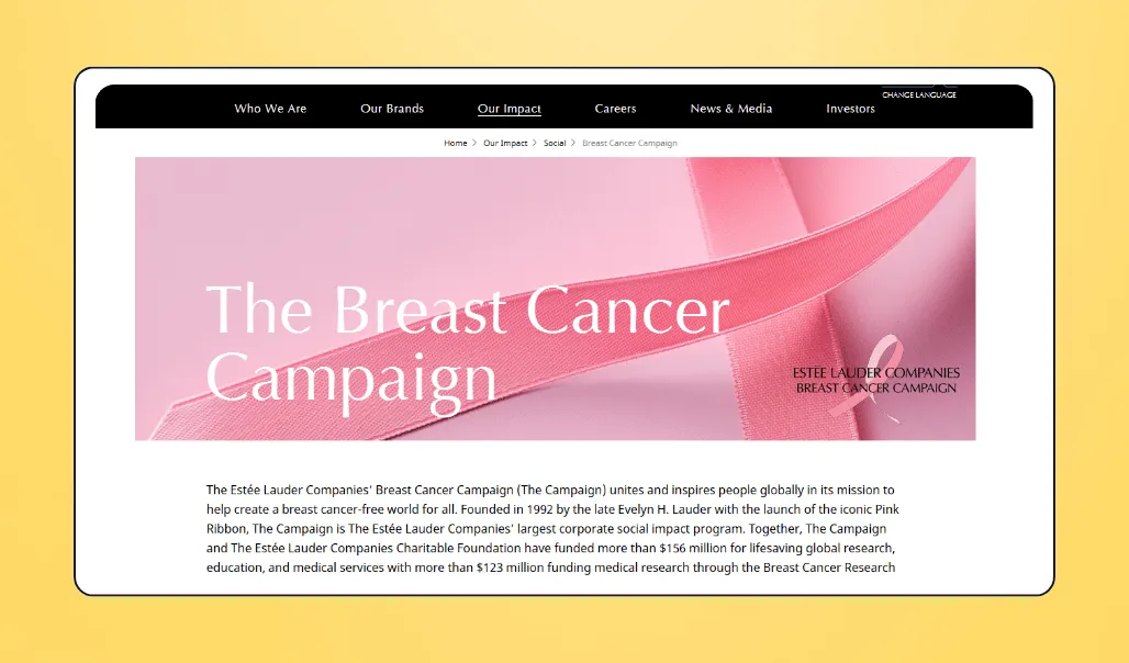 Launched in 1992 by Evelyn Lauder of Estée Lauder, the iconic Pink Ribbon campaign inspires work towards a breast cancer-free world. Since its inception, the initiative has funded more than $156M in research, education, and medical services.
