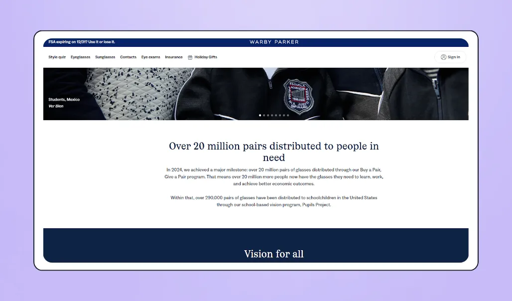 Warby Parker’s Buy a Pair, Give a Pair campaign donates a pair of glasses for every pair purchased, expanding access to vision care and childhood learning in low-income communities. To date, the project has distributed more than 20 million pairs of glasses.
