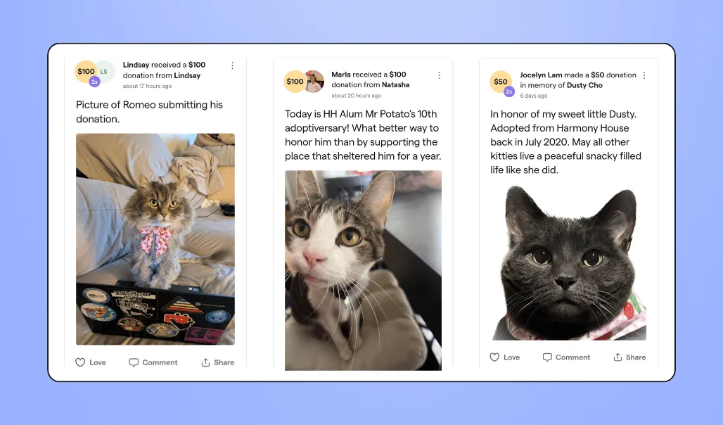 ⭐ Campaign highlight: A delightful supporter feed full of donors’ cat photos! Also, the campaign’s story section features several other ways to get involved, including volunteering, attending an upcoming event, or adopting a cat.