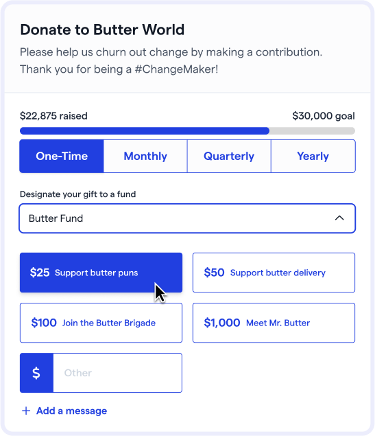 💡 Pro tip: Modernize your website and guide supporters toward meaningful action with Givebutter’s easy-to-use donation widgets.