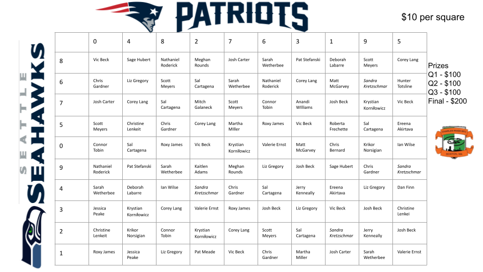 See below for an example of the sheet we will be posting once we fill 100 squares. We will fill a second sheet if we reach over 100 people. First, your name will be randomly placed in a square numbered 1 through 100. Then, when all 100 squares are filled, we will randomly assign numbers 0 to 9 on the X's in the top AFC row and Y's in the left NFC column. The X and Y numbers that line up with your name is the last digit score you need for a prize. For example, Chiefs 0 Eagles 17 at the end of the second quarter last year, the person lined up with 0 and 7 got the 2nd quarter prize.. Winners are determined at the end of the 1st quarter, 2nd quarter, 3rd quarter, and the end of the game.