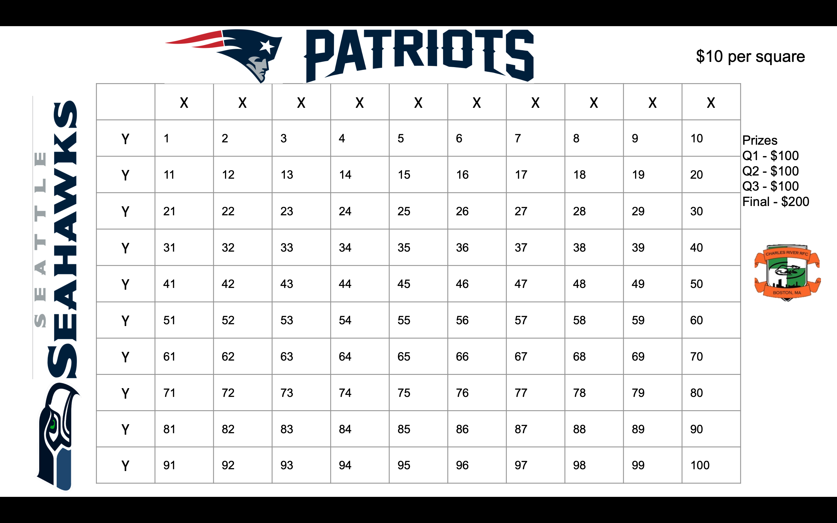10 SQUARES MAX PER PERSON - Squares are randomly assigned and will be posted on Charles River's Social Media prior to the game.
