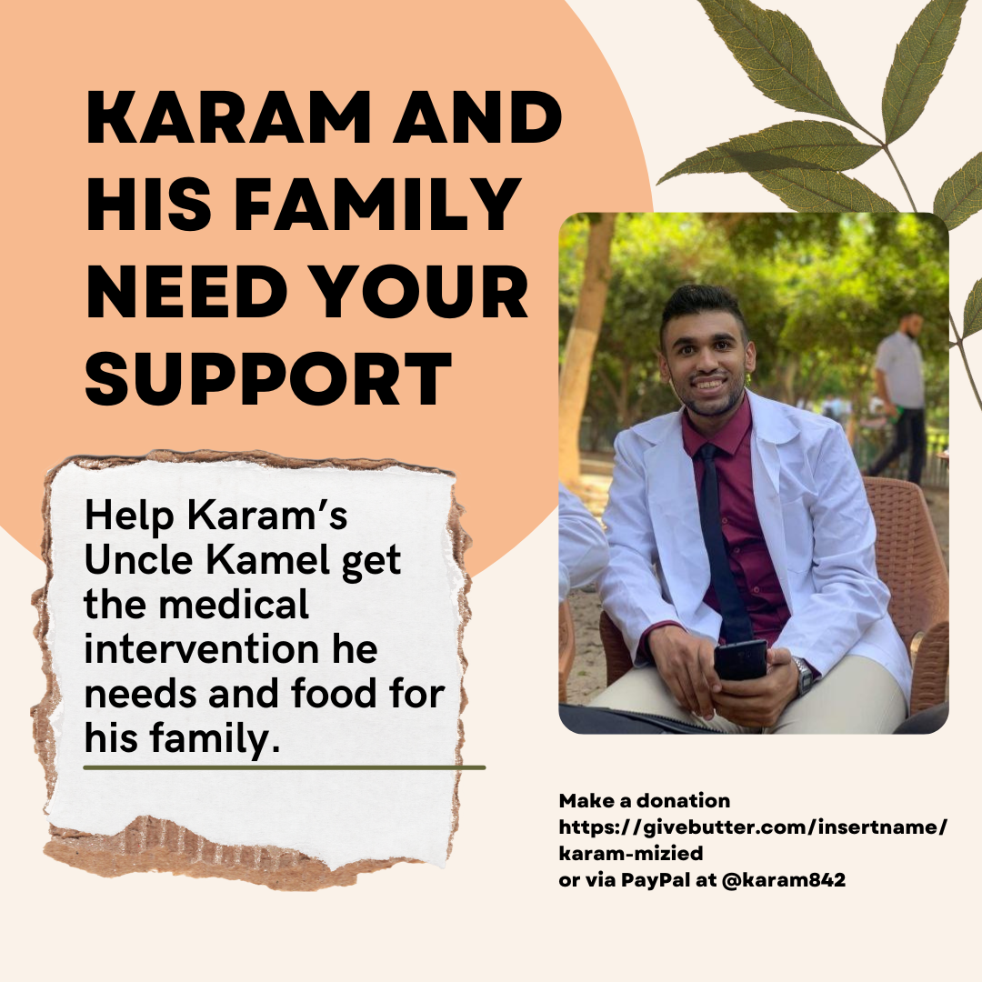 Of the utmost urgency, Karam's 66-year-old Uncle Kamel has sustained eye injuries from an Israhell drone attack. He needs surgical help, which he can receive when he crosses the border into Egypt once the border reopens. The cost of the border entry and surgery come to around $5300. The goal of this fundraise is $8000 to cover that and then to help Karam's family meet their nutritional needs. No one should ever be starving, and I beg of you to please give whatever you can to this family. They are beautiful people who will benefit greatly from whatever you can give.