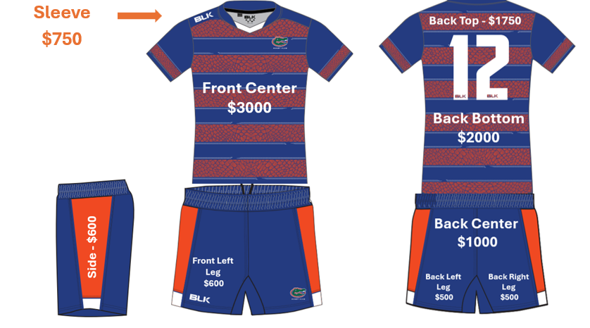 The UFRFC is trying to purchase brand new match kits for our players, which can be done with your help. This new kit includes jerseys, shorts, and socks which will be used to represent the University of Florida (and your business) on match day. Help support this year’s rugby team while also spreading awareness for your business!