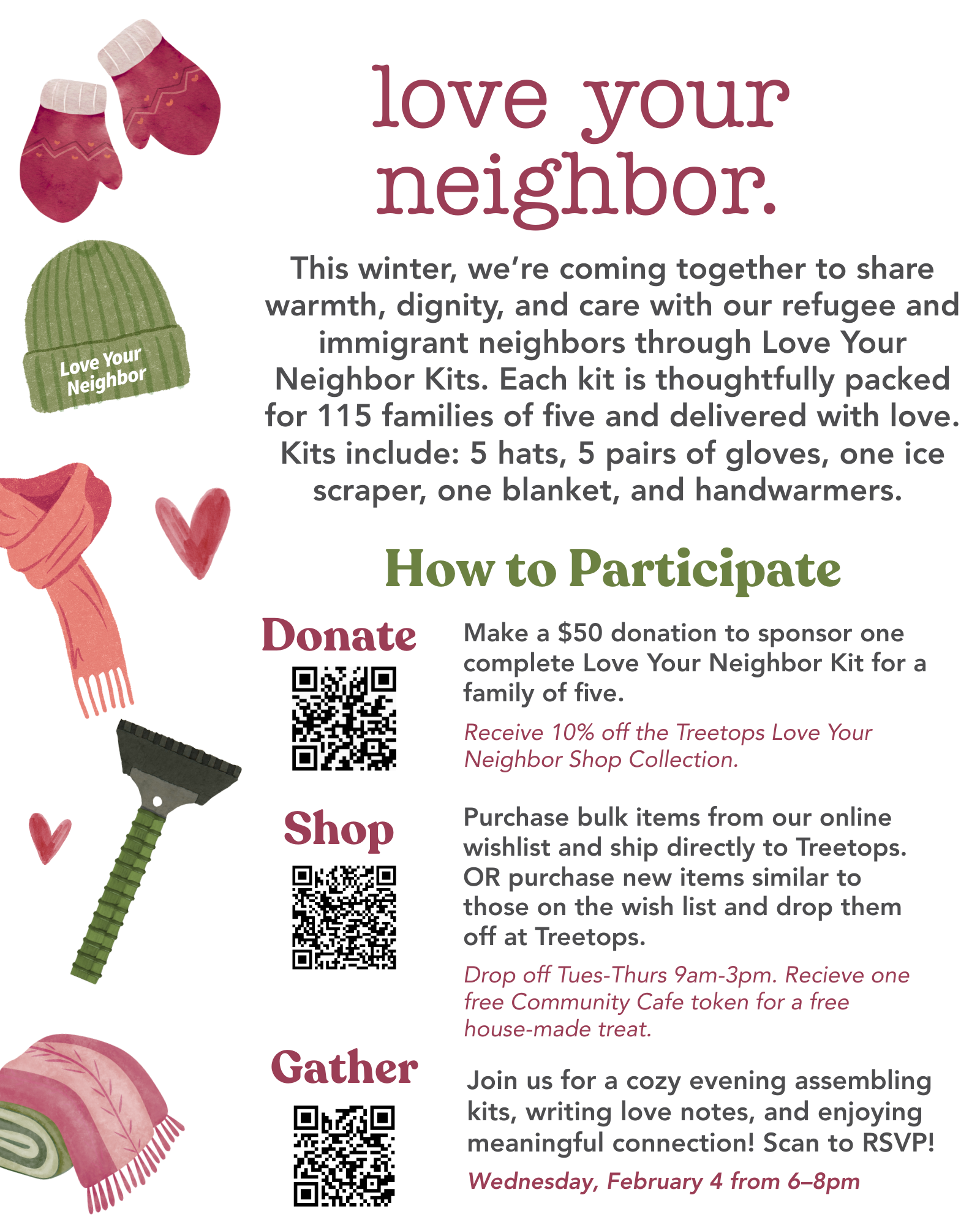 This winter, Treetops Collective is inviting our community to Love Your Neighbor in a tangible way by helping us create 115 winter care kits for refugee and immigrant women, students, and families in our programs.