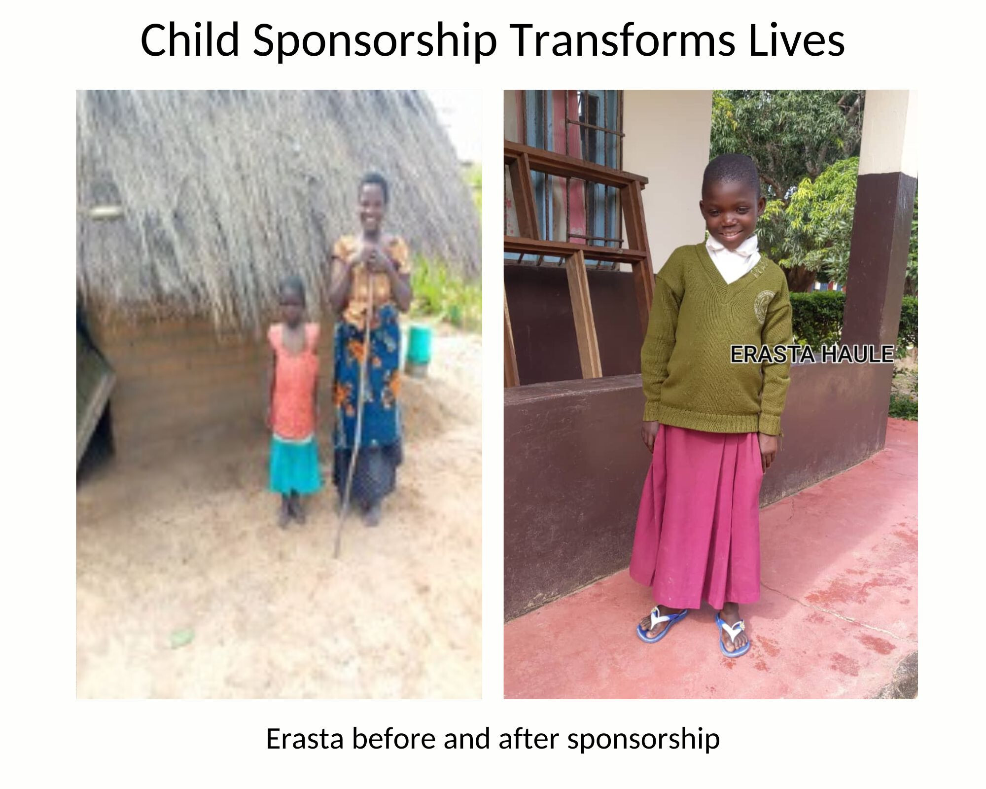 Erasta's story exemplifies the transformative power of sponsorship. Living with her elderly grandmother in a dilapidated one-room home, Erasta endured hardship and uncertainty. She slept on a cold dirt floor and often went hungry. But with a sponsor, everything changed. Her basic needs are now met, and she's not only attending school but excelling—becoming one of the top students in her class. Erasta's future is now filled with hope and the security of knowing she has someone who believes in her.
