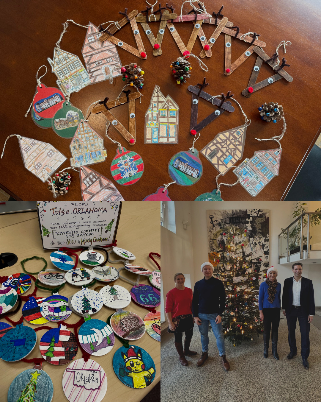 Top: Ornaments from Celle. Bottom Left: Ornaments from Tulsa. Bottom Right: Celle's Mayor Jรถrg Nigge and staff