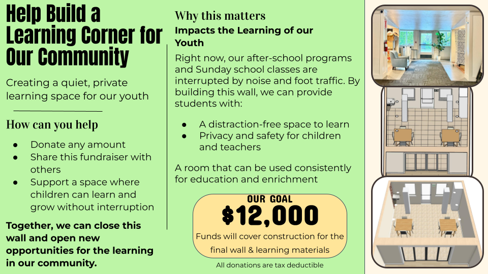 To complete this project, I am working to raise $12,000, which will go toward construction of the wall, furniture, and other essential improvements needed to make the space usable and welcoming.