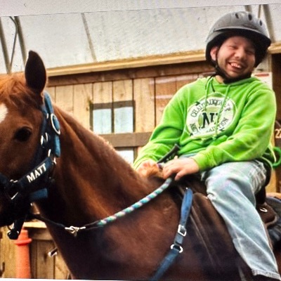 My name is Matt and I have been riding at Centaur Stride for 15 years! I love going there and riding Dude. I’m able to go to the barn twice a week and ride Dude. I also help out by volunteering there as well. Dude is my very special horse — he is so gentle. I love taking care of Dude; by brushing him, and after every riding lesson giving him a treat. We sure have a special bond! I really enjoy learning new drills. Dude will walk beside me by command. I love riding out on the trails.