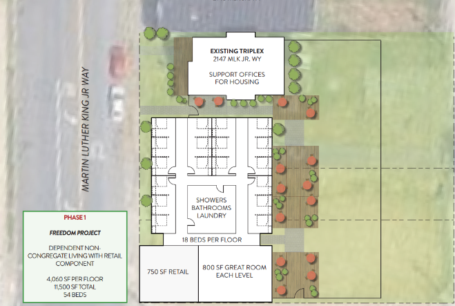 This is the first phase of a larger, three-part plan to build a more lasting housing model — one that goes beyond emergency shelter. Our goal with phase one is to build housing units that will be the first step toward housing security for our unhoused neighbors. This housing unit will provide group housing and integrated daily living assistance.