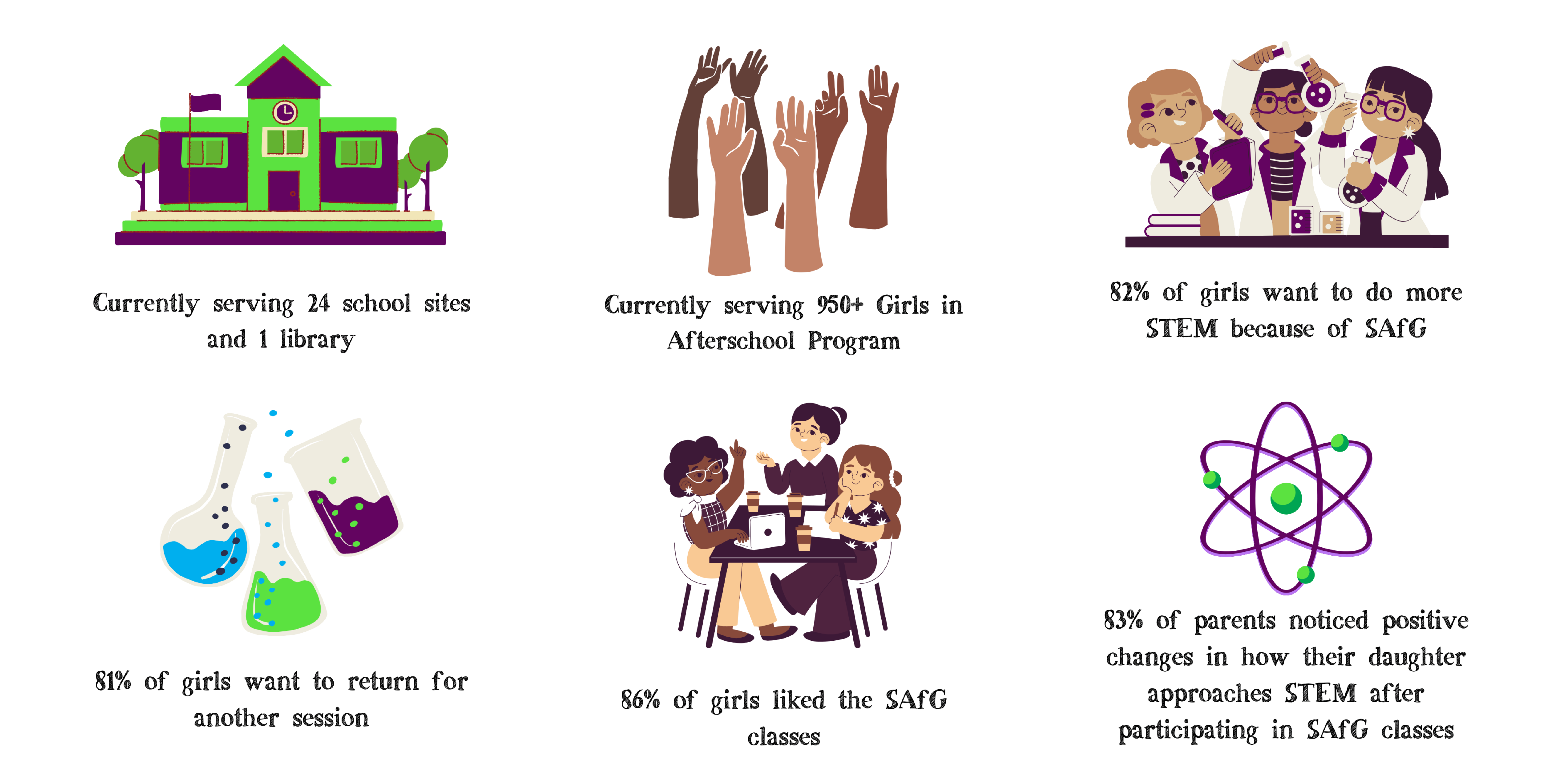 SAfG is dedicated to empowering girls to see themselves as future scientists, engineers, and innovators. Through afterschool and library programs, spring break and summer camps, and family STEAM events, we capture their interest early and help young girls develop positive STEM attitudes and identities. These hands-on experiences spark curiosity, build confidence, and inspire girls to envision themselves as future STEM leaders. We are Changing the Face of Science—one girl at a time.
