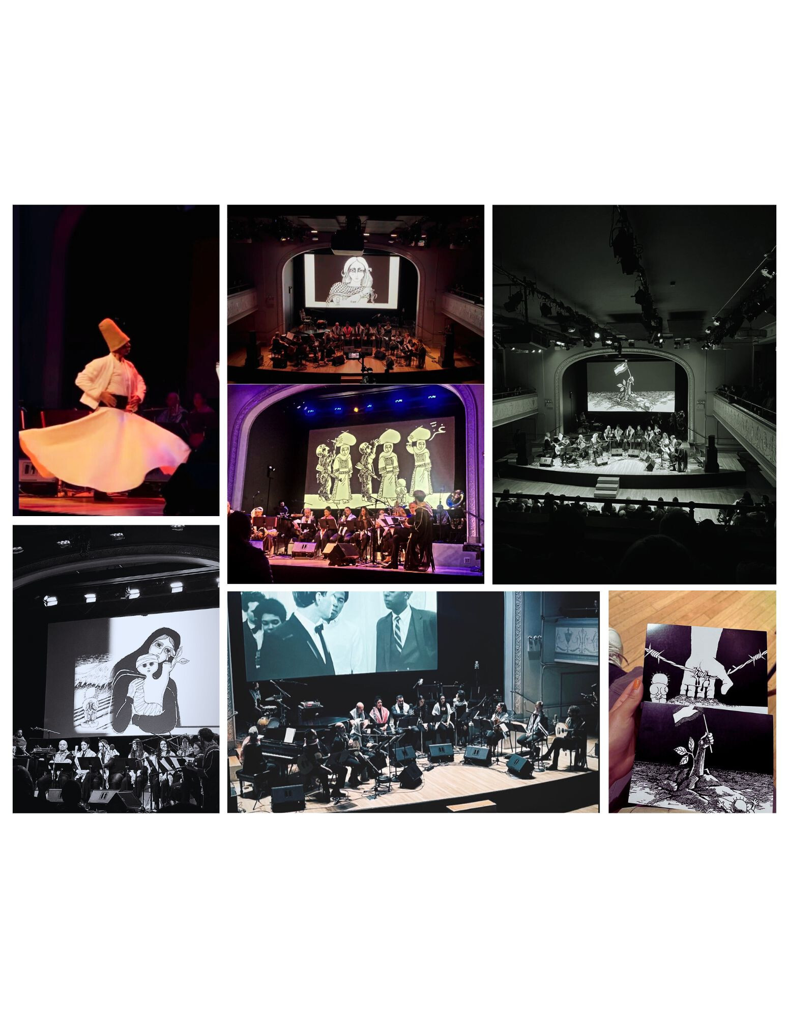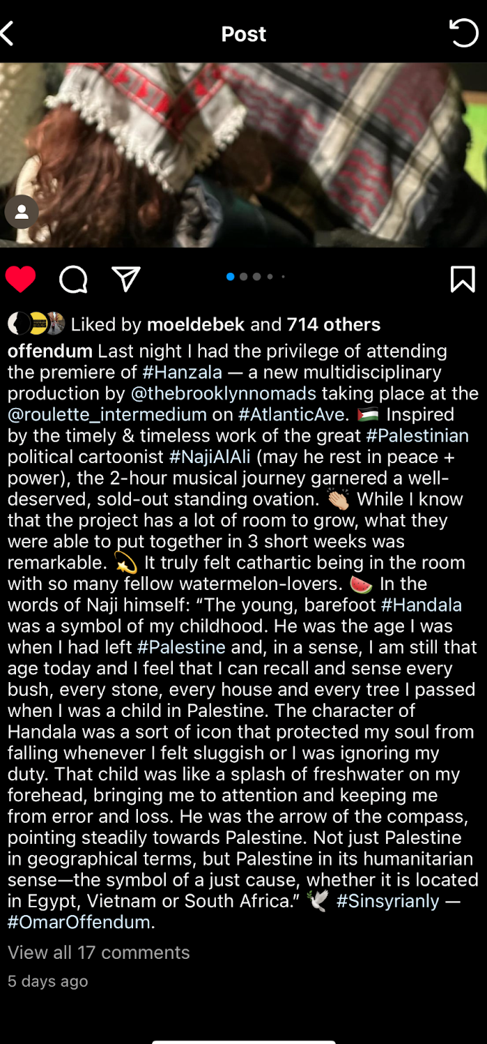 On Sat Feb 24, 2024, we presented our pilot event of Hanzala, a new show centered around the iconic cartoon of the Palestinian child that was created by the late Naji al-Ali. The show included live music, cartoon animation, sufi dance, guest artists, and more. The reception was overwhelmingly positive; we were told it was impactful, powerful, and timely. It's safe to say that everyone got something experiencing the Hanzala Performance, whether it was gaining awareness, feeling a part with the community, or healing.