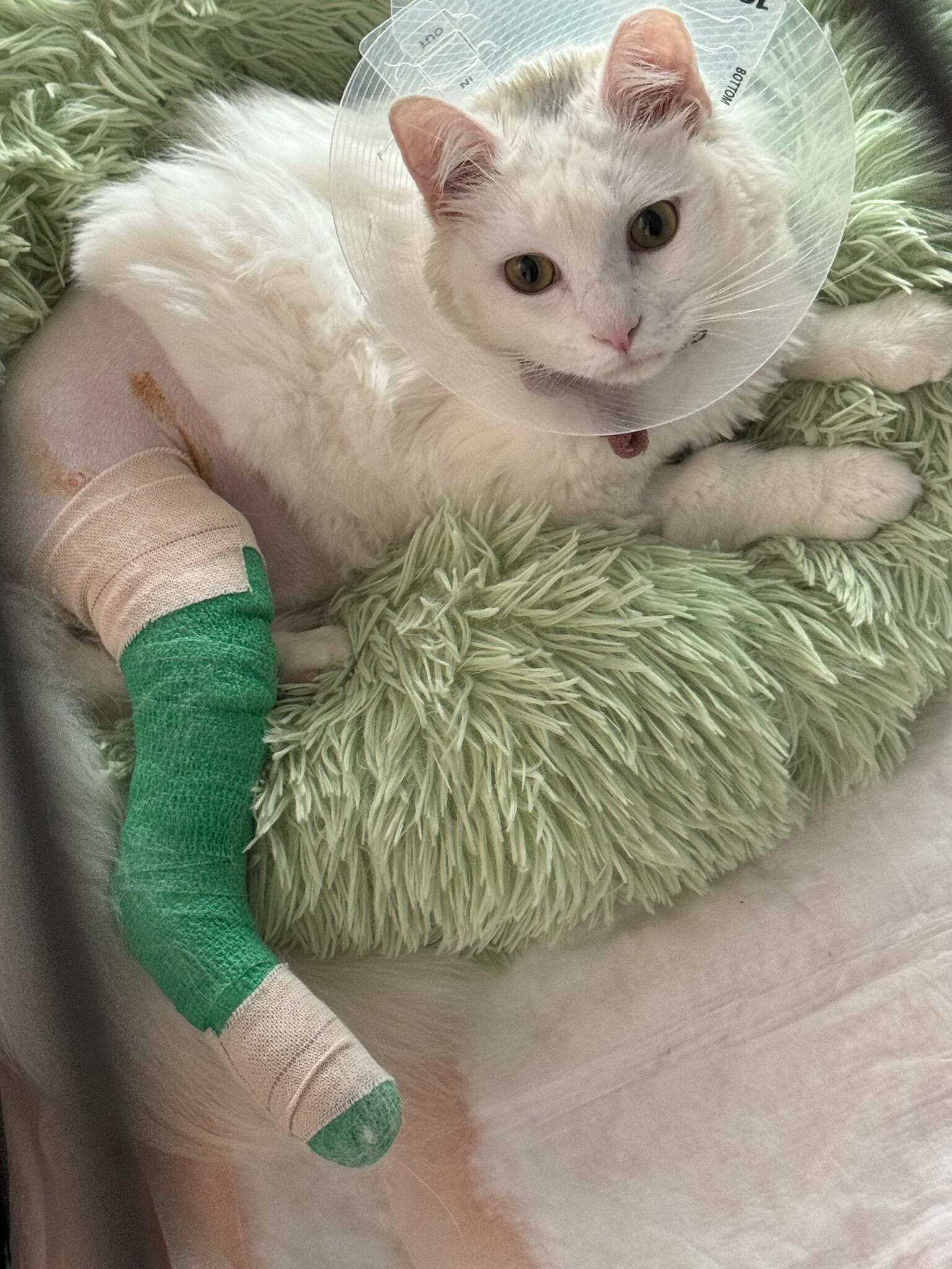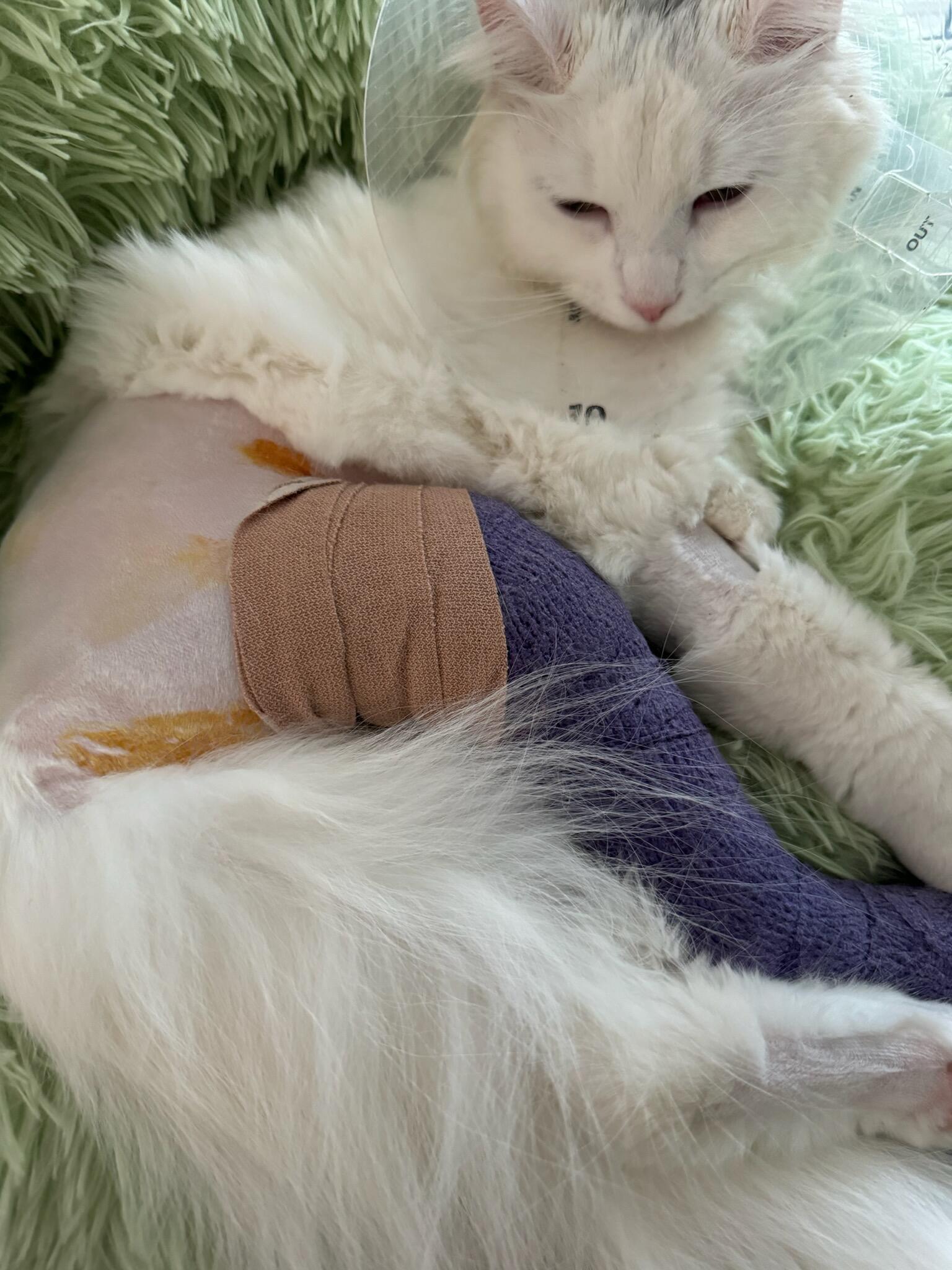 Snowball is slowly getting over his surgery. Not happy with his weird bandaged leg, nor with that horrible plastic collar thing. But he is eating and has managed to use his litterbox.