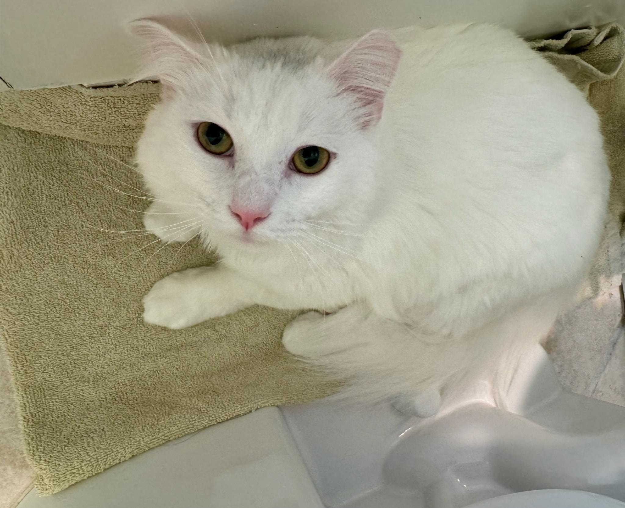 He was found in a feral colony where volunteers feed and neuter the neighborhood stray and homeless cats. Snowball is only around 8 mnths old now and his rescuer already has him purring like crazy and wanting lots of pets.